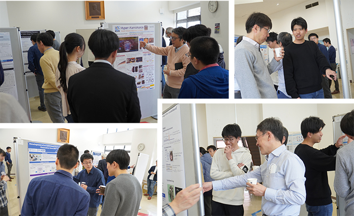 今回も企画チームの熱心な呼びかけが功を奏して、修士課程1年から若手・シニアスタッフまで総勢21人のポスター発表があり、およそ50人が参加する大盛況な会となりました。なかでも、LHC-ATLAS実験によるヒグシーノ探索やウィーノの輻射崩壊を用いたBino-Wino Co-Annihilationシナリオの探索、超伝導量子ビットを用いた波状ダークマター探索、HEP論文からコードを自動生成するLLMベースのシステム開発、Hyper-Kamiokandeといったプレゼンテーションの前には多くの参加者が集まり、研究の思考プロセスや将来的な可能性を見据えた質問をはじめ、活発な議論が交わされました。実験は違えど「物理」や「検出器技術」といった共通言語で話題が広がったり、量子研究の新しいアプローチに互いの知的好奇心を刺激し合ったりと、個々のプロジェクトや研究室の垣根を超えた人の交流や研究の芽を探し出す貴重な時間となりました。